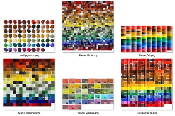 Left as an exercise for the programming-inclined reader is incorporating similar palettes into generative art programs. When a drawing routine requests a color, the value of a pixel or the average of a group of pixels would be returned, resulting in slightly different results each time. A similar effect could be achieved more compactly by deriving weighted values from the raw palette images.